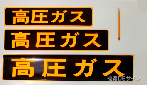 一般高圧ガス保安規則関係例示基準1-4-1、2では, 横長タイプで3 種類の大きさがあります。車幅により取り付ける標識が異なります。