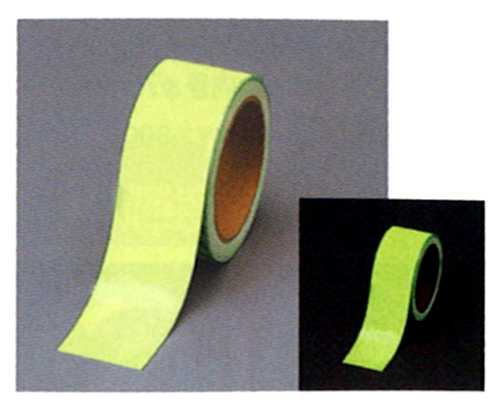 平成22年4月消防予第177号により高輝度蓄光テー^プ等が(光を発する帯状の標示」という法令用語として定義され60分未満のバッテリー付電気式通路誘導灯や照度不足の箇所において高輝度蓄光式誘導標識を設置する際のサポート用品として認められました。