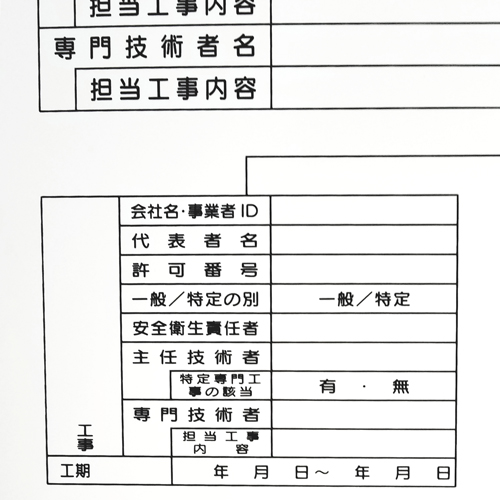 具体的には、 「代表者の氏名」、 「一般建設業又は特定建設業の別」、「許可番号」、「特定専門工事の該当の有無」、「監理技術者補佐」