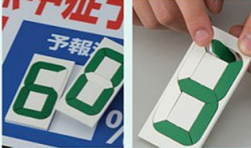 インターネット等から取得した予報最高気温と予報湿度を元に、デジタル数字の数字をあわせて表示板にセットして下さい。