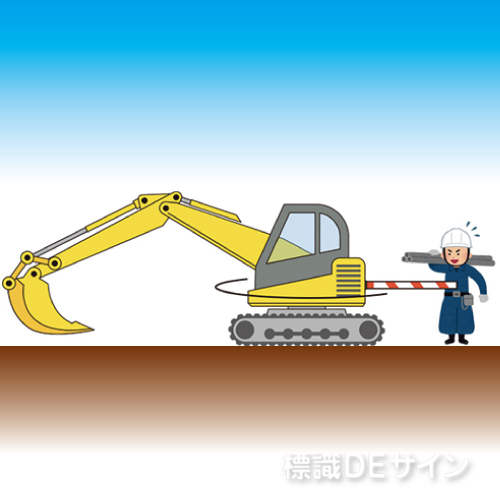 重機の背後にスペースを確保し、作業員が旋回する重機の